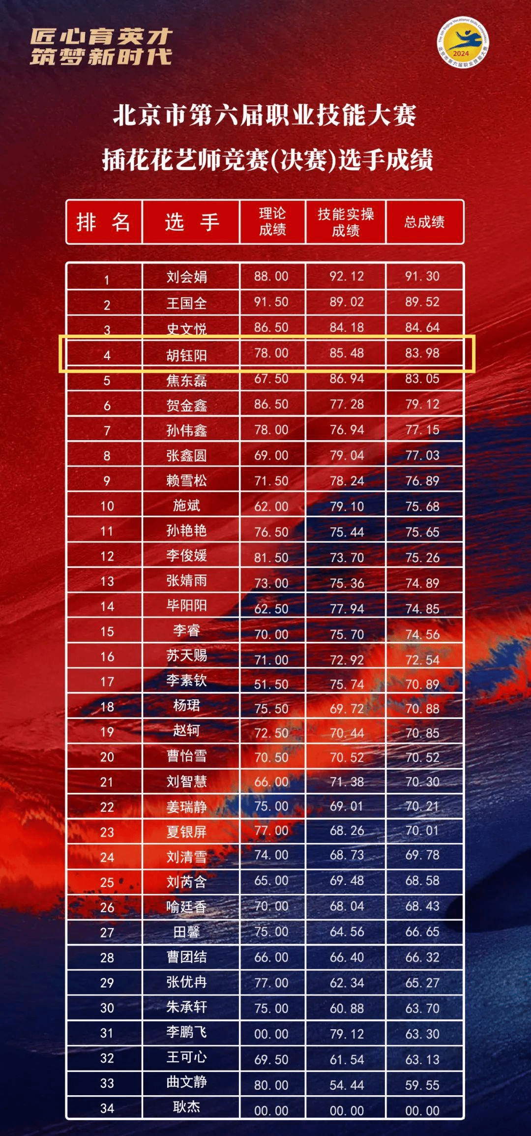 近日,以“匠心育英才,筑梦新时代”为主题的北京市第六届职业技能大赛“赛展演会”在国家会议中心盛大举行。经各赛区初赛、复赛层层选拔,我院2022级学生胡钰阳表现出色,成功晋级插花花艺师竞赛(决赛)。在34名决赛选手的激烈竞争中,取得第4名优异成绩并获国家一级插花高级技师称号。
