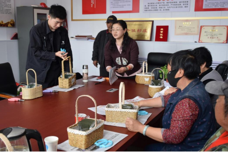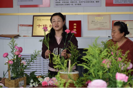 活动当天,村委会活动室内花香四溢。教学团队特别准备了十几组花篮插花材料,侯芳梅现场示范东方插花的层次构建技巧。村民们跟着侯老师的步骤,将康乃馨、花毛茛等花材巧妙组合、错落有致,原本朴素的藤篮逐渐变成综合自然美和艺术美的花艺作品,活动现场花香馥郁,村民们学习热情高涨。